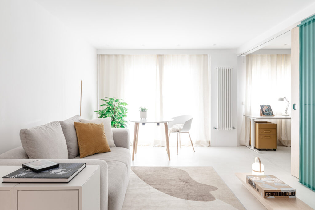 La idea principal del proyecto es resolver únicamente a través de una pieza central las necesidades de los espacios adyacentes, con el objetivo de hacerlos lo más abiertos y flexibles posible. Para conseguirlo, colocamos las zonas húmedas y elementos de almacenamiento del resto de espacios dentro de un núcleo de chapa. Este dispositivo esconde también los cerramientos móviles que independizan las estancias según su uso a lo largo del día. De esta forma conseguimos una casa organizada en torno a una pieza singular, que caracteriza el proyecto al entender tres grados de exterioridad y comportamiento climático diferenciados.
